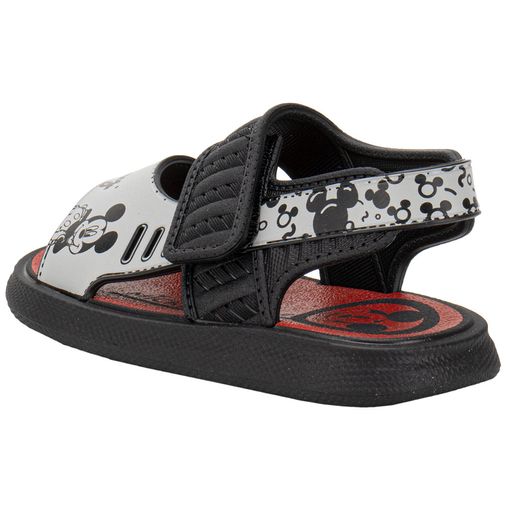 Sandália Disney: Com estampa clássica do Mickey, em tons de preto e cinza que combinam com qualquer roupinha.