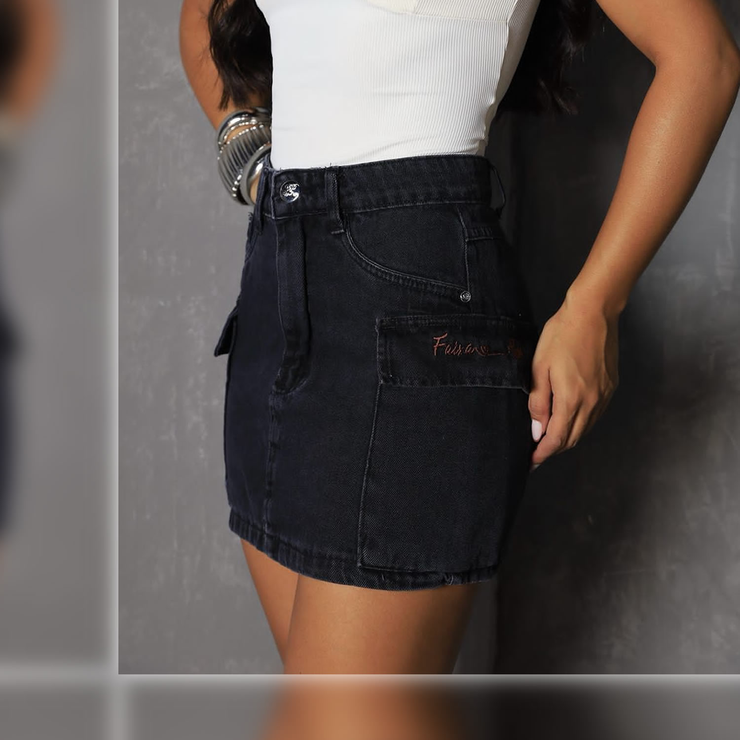Vista-se com maior conforto e cause impacto por onde chegar com essa Saia Jeans Cargo sem Lycra 100% Algodão da Faixa Rosa.